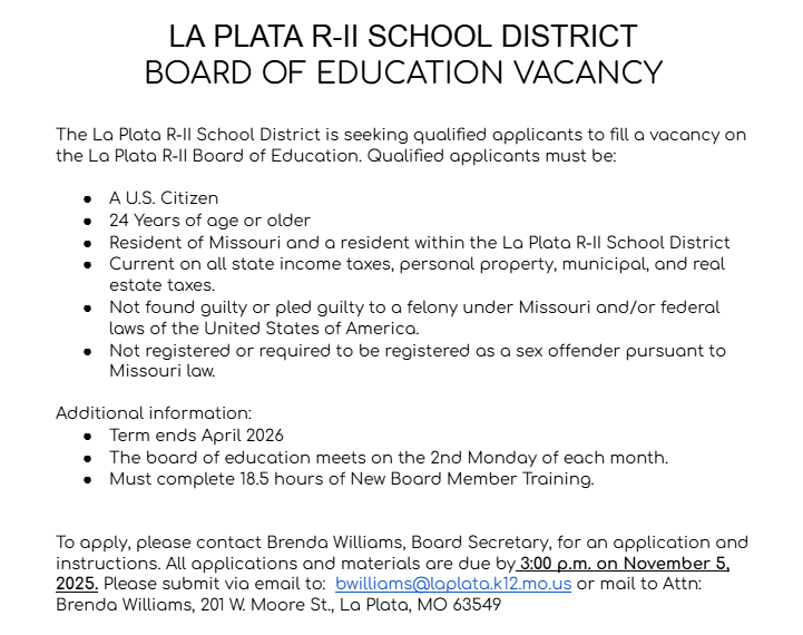 Reports will be sent home during Parent-Teacher Conferences. If you need to receive your child’s report sooner, please contact staylor@laplata.k12.mo.us. Any reports not picked up at conferences will be mailed home.