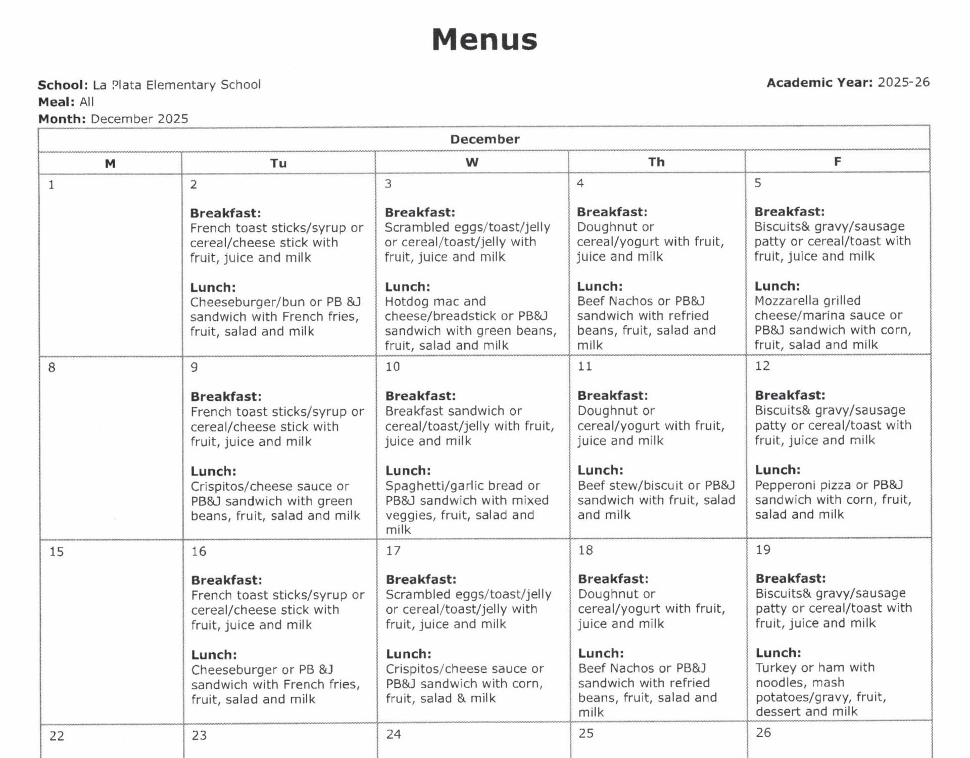 Additional meals and a la carte options available for grades 7+. Not all options are available daily.