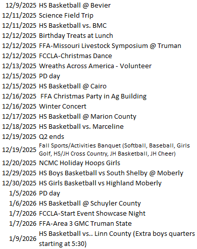 6pm Basketball vs Marceline at home (Gate: MHelm, BJones Concessions: BPippin MPearson)